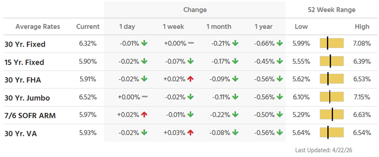 Interest rate and annual percentage rate (APR) are based on current market conditions as of 04/23/2026, are for informational purposes only, are subject to change without notice and may be subject to pricing add-ons related to property type, loan amount, loan-to-value, credit score and other variables. Estimated closing costs used in the APR calculation are assumed to be paid by the borrower at closing. If the closing costs are financed, the loan, APR and payment amounts will be higher. Contact us for details. Additional loan programs may be available. Accuracy is not guaranteed, and all products may not be available in all borrower's geographical areas and are based on their individual situation. This is not a credit decision or a commitment to lend. Actual interest rate, APR, and payment may vary based on the specific terms of the loan selected, verification of information, your credit history, the location and type of property, and other factors as determined by Prosperity Home Mortgage, LLC. Not available in all states. Rate is as of 04/23/2026 and is subject to change at any time without notice. Opinions, estimates, forecasts, and other views contained in this document are those of Freddie Mac’s economists and other researchers, do not necessarily represent the views of Freddie Mac or its management, and should not be construed as indicating Freddie Mac’s business prospects or expected results. Although the authors attempt to provide reliable, useful information, they do not guarantee that the information or other content in this document is accurate, current, or suitable for any particular purpose. All content is subject to change without notice. All content is provided on an “as is” basis, with no warranties of any kind whatsoever. Information from this document may be used with proper attribution.