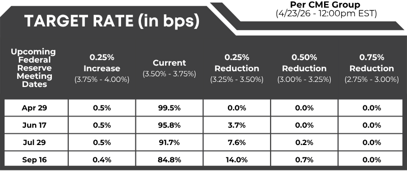 FedWatch: Target rate (in bps) possibilities, according to the CME Group (as of 04/23/2026 – 12:00 PM EST):