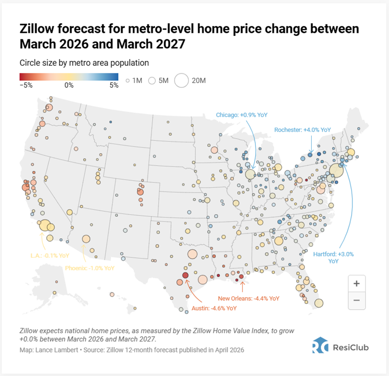 Zillow forecast for metro-level home price change between March 2026 and March 2027
