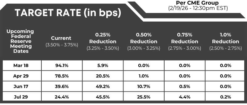 FedWatch: Target rate (in bps) possibilities, according to the CME Group (as of 02/19/2026 – 12:00 PM EST):