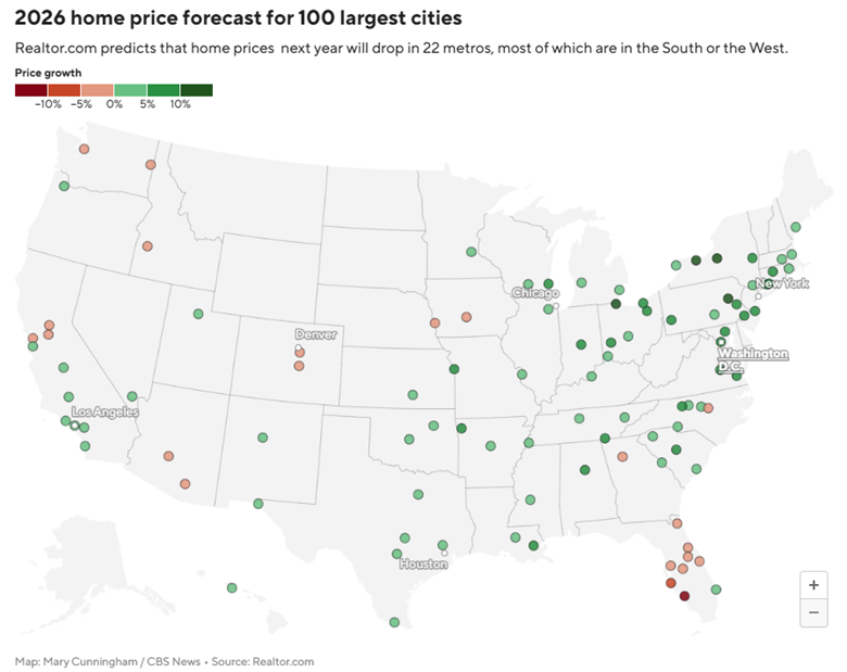 Home prices are poised to dip in 22 U.S. cities next year, a new analysis says. See where: